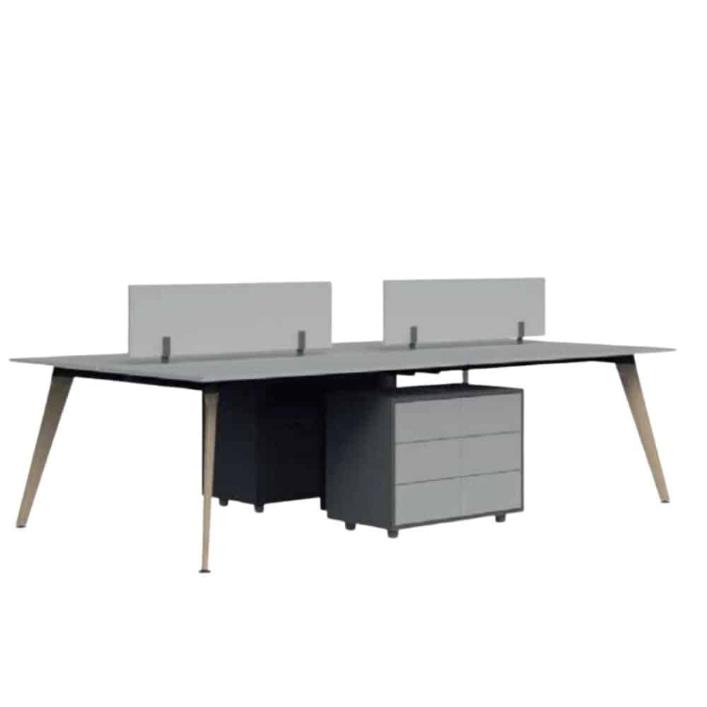 שולחן משרדי דגם אניגמה. לשולחן אפשר לבחור כמה אפשרויות בהתאמה אישית: שלד לשולחן, כולל קושרות מתכווננות. רוכב על שלוחה. בנצ’ לארבעה.