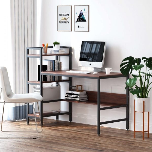 שולחן עץ סיבית דחוסה בציפוי פורמייקה צבע אגוז כהה בגודל 106 X60 ס”מ כולל ספרייה עם מידוף מודולרי,